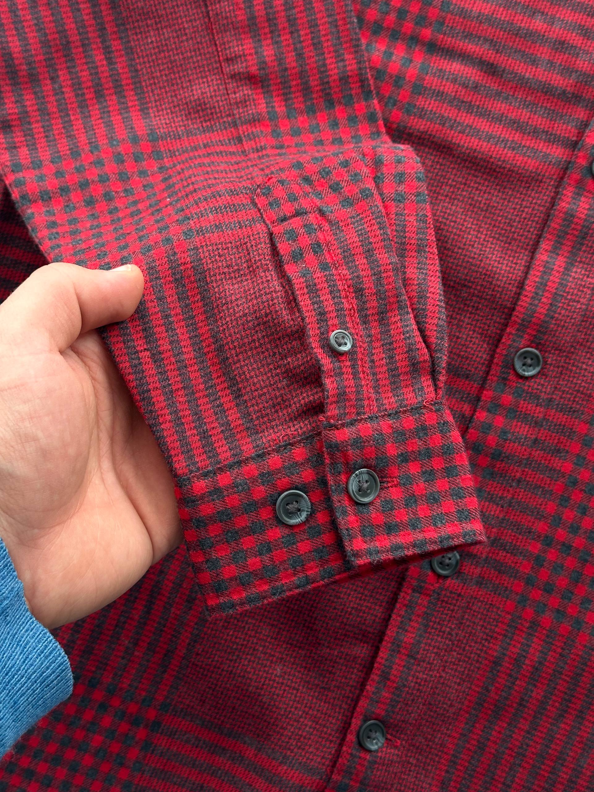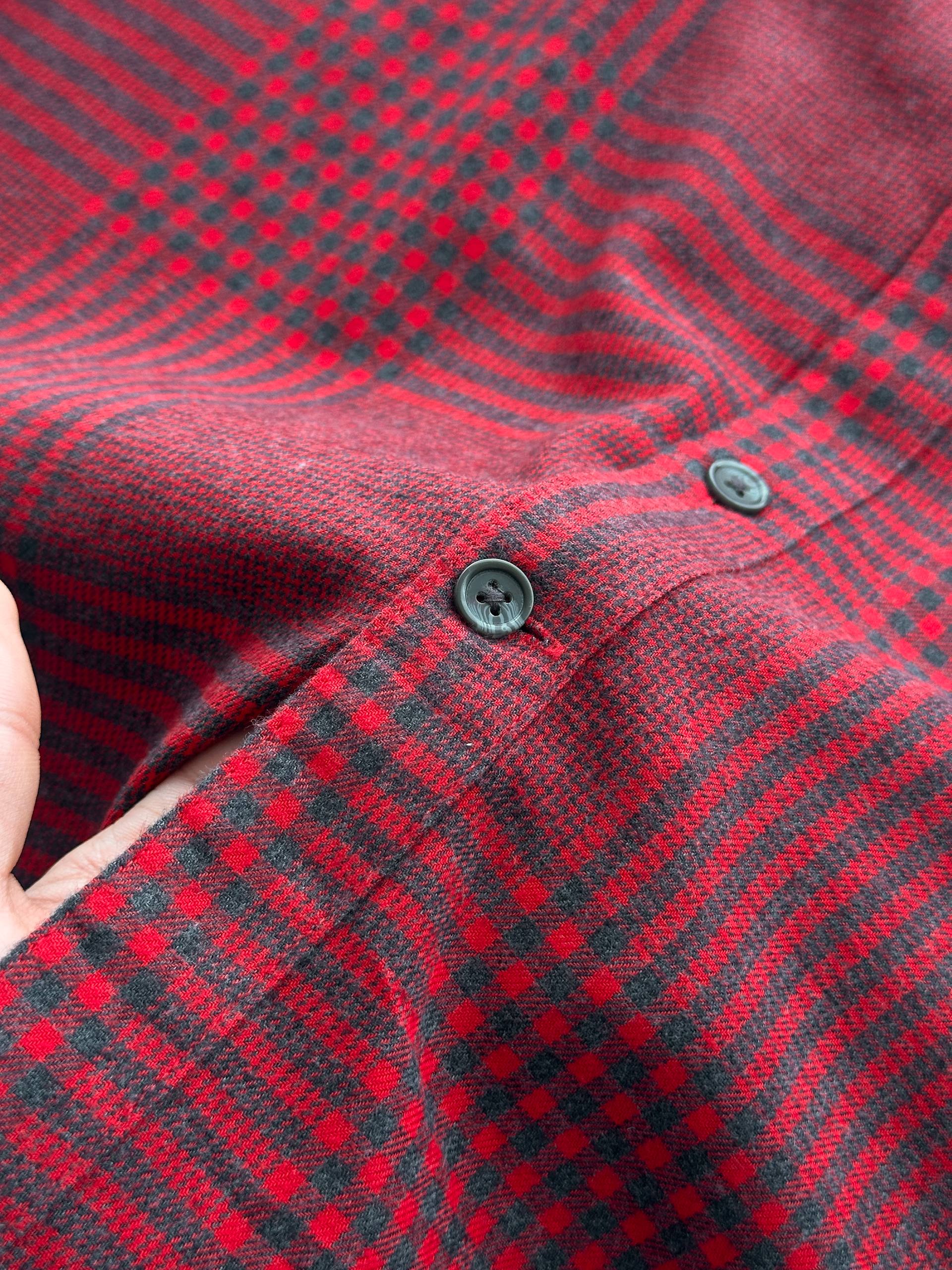 طرح چهارخونه قرمز با خطوط مشکی، استایلی کلاسیک و جذاب برای استفاده روزمره و نیمهرسمی ایجاد میکند.